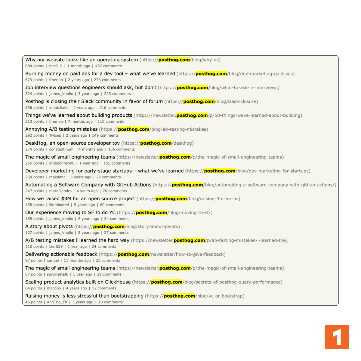 Similar to GitHub, PostHog didn’t treat Hacker News as just a launch platform, but as a community to engage with. It became one of their key content marketing channels, where they regularly shared posts about startups and open source.